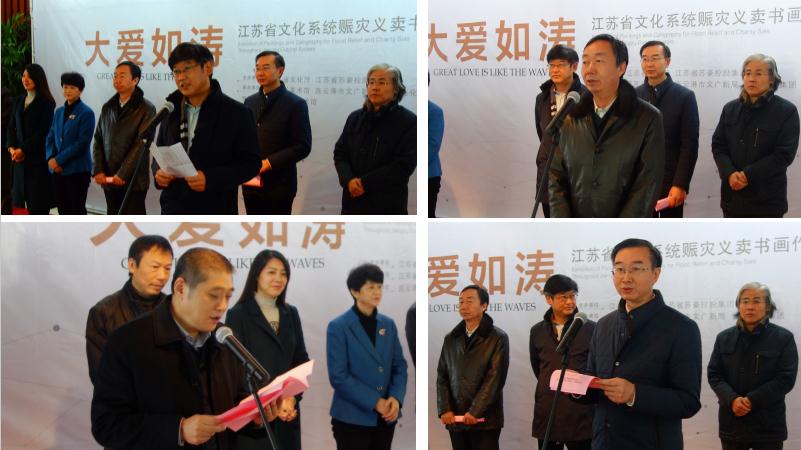 開(kāi)幕式上,江蘇省文化廳副巡視員徐循華、連云港市人民政府副市長(zhǎng)董春科、愛(ài)濤文化集團(tuán)黨委書(shū)記、董事長(zhǎng)張發(fā)松致辭;連云港市政協(xié)副主席、民盟市委主委范忠華、愛(ài)濤文化集團(tuán)常務(wù)副總陳云梅、江蘇省美術(shù)館創(chuàng)作中心主任王國(guó)斌、連云港市美術(shù)館館長(zhǎng)、書(shū)畫(huà)院院長(zhǎng)古強(qiáng)出席開(kāi)幕儀式。連云港市文廣新局局長(zhǎng)田明主持開(kāi)幕儀式。
