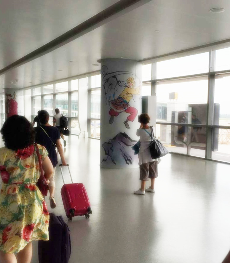 下了飛機疲憊的倦容適合欣賞一些美景,隨著輕輕的步調,環顧四周,灰白色的墻上已換上新裝,沒有半點亂花漸欲迷人眼的浮躁感,不驕不躁的水墨情呈現給燈箱是再合適不過的,整個T2航站樓的長廊儼然開拓了一副新天地,斜陽西照,深色的柱子上一幅幅西游記的經典場景回放著映入眼簾,穿過獨具特色的長廊,陽光透過玻璃墻,照射在灰色的地面上。恢弘大氣的長廊里,有一種內斂含蓄的文化底蘊在涌動,長廊如紙,柱體如虹,旅客的性情、思緒,融入在造型、筆墨、意蘊之中,整個長廊里流動著平實敦厚,溫潤超逸的謙謙之音,旅客亦喜焉,似樂也。
