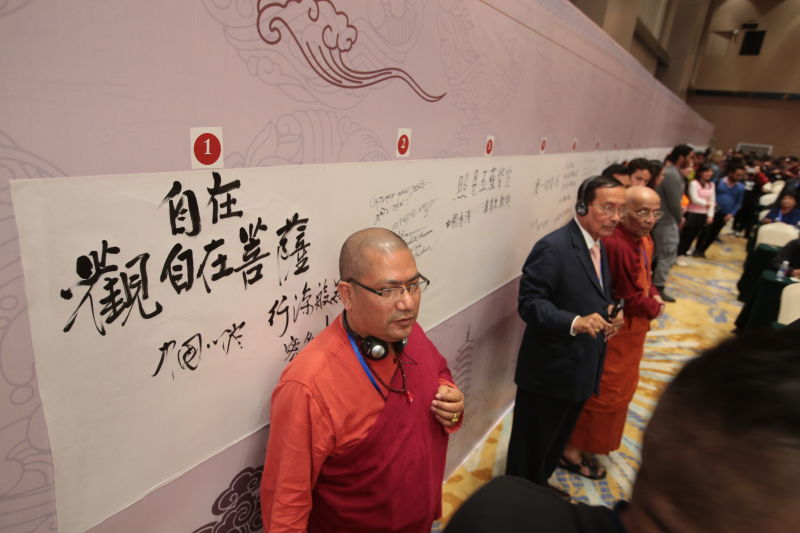 開幕式舉行了“一帶一路”沿線國家代表書寫《心經(jīng)》儀式,來自30個國家的學者、高僧、大使館參贊、留學生代表共同用本國語言書寫了《心經(jīng)》。并從多個角度加以研討,從這篇古代先哲引導人們追求至善至美至真的經(jīng)文中感悟不朽的精神境界,意義十分重大。