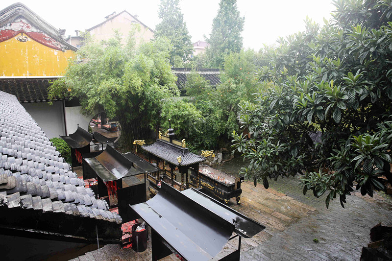 先蠶祠是古典廟堂式建筑,正面門樓飛檐斗拱,氣勢軒昂。旁側是八字形清水磚壁,樸素雅潔,再前過柵門是小廣場,原是香客集散處。至今每逢小滿,香火旺盛,唱戲敬蠶神。