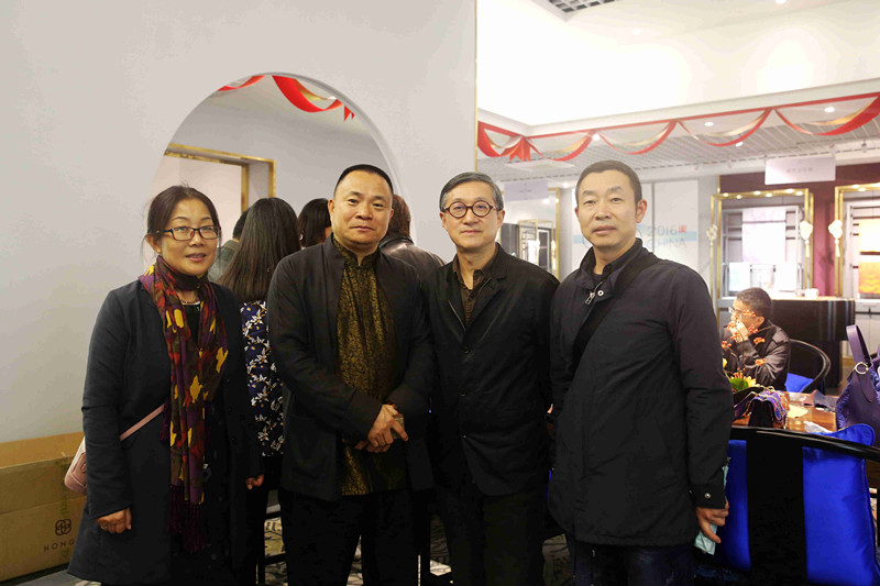 鼎盛絲綢董事長吳建華與江蘇省工藝美術大師、弄影時裝藝術顧問顧鳴、華藝品牌工廠直營中心總經理徐清、蘇豪傳媒副總經理單鳳艷合影。